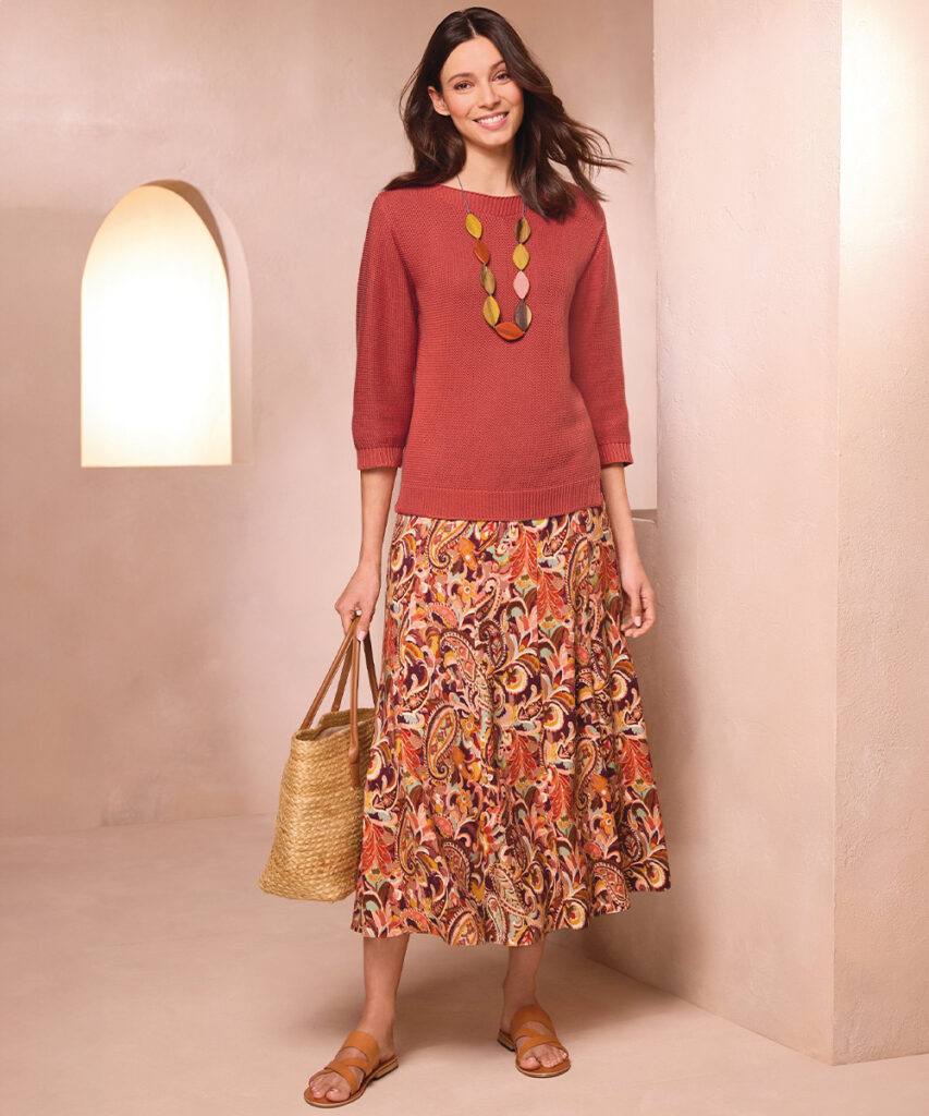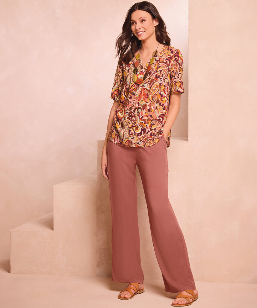 Our Paisley Printed Tunic, and its intricate design mirror the fiery hues of dusk. Pair with our terracotta Pull-on Trousers for a look that's both effortlessly stylish and endlessly comfortable.