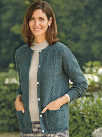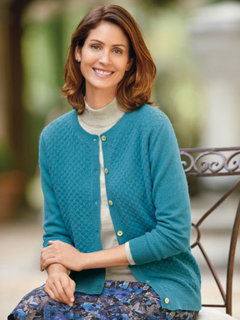 In striking topaz blue, this textured lamsbwool cardigan features pretty leaf-shaped pointelle detailing on the front panels and shell buttons for sophisticated detailing.