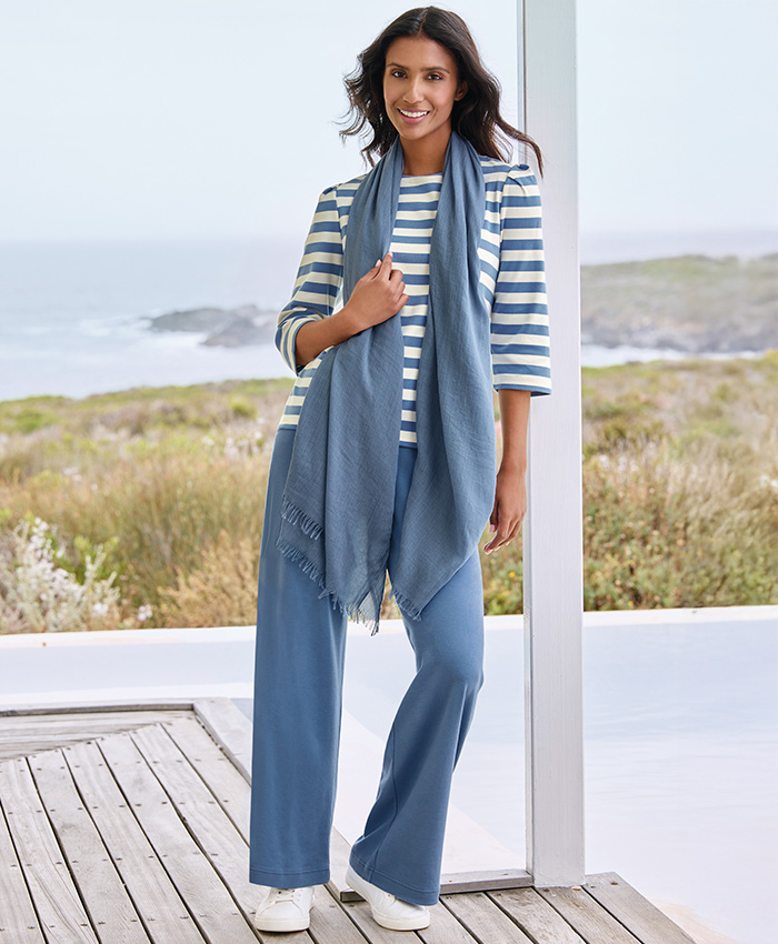 Drift into summer style with our exquisite range of coastal blue essentials, designed for effortless everyday wear. We've prioritised both comfort and breathability when creating these pieces, ensuring they feel as good as they look. The thoughtful shaping is truly flattering without clinging, while the wide legs of our Tie Waist Trousers and relaxed sleeves of our Block Stripe Top promote unrestricted movement for all-day comfort. Elevate your summer wardrobe with this timeless stripe top– a classic pattern that promises enduring style, year after year.