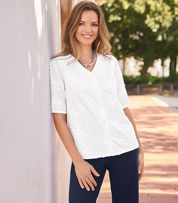Bring a touch of delicate beauty to your wardrobe with our sought-after Embroidered Blouse. This wonderfully light and fresh white piece is set to introduce classic refinement and a sense of gentle grace to your everyday style. The inclusion of short sleeves and thoughtful side slits at the hem ensures that this blouse, made from pure 100% cotton, offers exceptional breathability and supreme comfort during warmer days. Discover the subtle charm and versatility of this essential addition to your wardrobe.