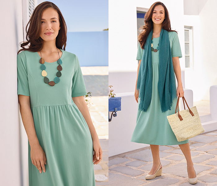 Discover the return of our much-loved Plain Jersey Dress, now exquisitely updated in a gorgeous sage colourway and with a thoughtfully improved fit. Designed with flattering princess seams that contour the figure and soft gathers at the waist for gentle shaping, this garment is the epitome of effortless summer dressing, offering a breathable and timeless aesthetic. Wear it on its own for an easy, feminine charm, or enhance its appeal by pairing it with our soft 100% Cotton Scarf, a beautifully crafted Wooden Necklace, and a stylish summery Jute Bag.