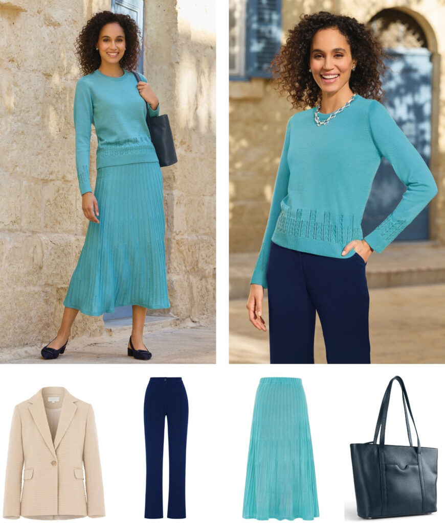 Take, for instance, the first one on our list is the Stitch trim jumper in Kingfisher. While it captures the essence of elegant clothing for older women, its true strength lies in its remarkable adaptability: