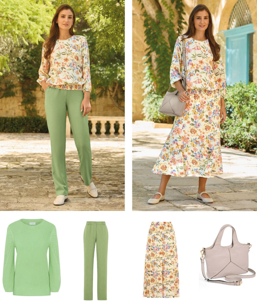 Our latest arrivals invite a sense of total renewal into your spring wardrobe. For those who prioritize effortless elegance, our softly tailored Printed blouson top offers a fluid drape that pairs perfectly with structured trousers. This also comes in a matching skirt which glides beautifully with every step. If you're looking for depth and detail, our Pointelle jumper provides a lightweight warmth, featuring intricate open-work patterns on the arms for breathability. And should the weather prove unpredictable then be prepared with our versatile Reversible jacket in soft cream and green.