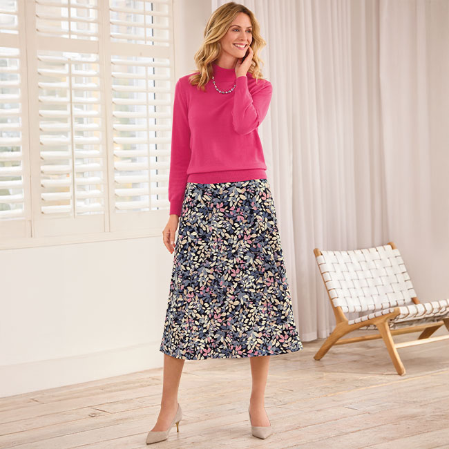 Celebrate spring's arrival with a touch of vibrant pink. Our Merino Turtleneck is designed for effortless style and comfort, whether worn alone or layered under a jacket. For special occasions, create a coordinated look with our Brushed Jersey Skirt, a piece that combines comfort and style. If you prefer to not wear skirts, our matching Leaf Print Jersey Top is the perfect alternative. Its three-quarter sleeves capture the lightness of spring, and it pairs beautifully with our pewter Casual Trousers and Textured Jacket. This top offers a subtle yet striking way to embrace the season, adding a touch of natural beauty to your wardrobe.