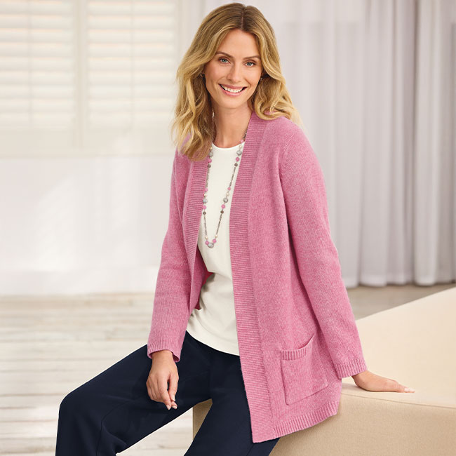 Longline cardigans, like our pink Longline Cardigan, and lightweight merino turtlenecks are perfect for layering.