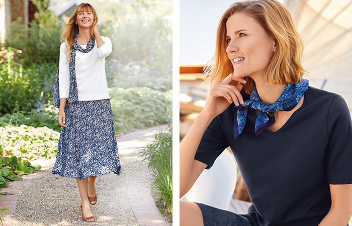 “Lastly, I agree with Michelle, a scarf can add a fabulous highlight to a casual outfit! Smaller scarves that tie around the neck can provide a wonderful pop of colour while long, fluid scarves that effortlessly fold and drape provide an interesting alternative to a necklace! Some of our scarves are made from the same fabric as our skirts or trousers which beautifully link a top to a bottom piece creating a stunning, considered ensemble”.