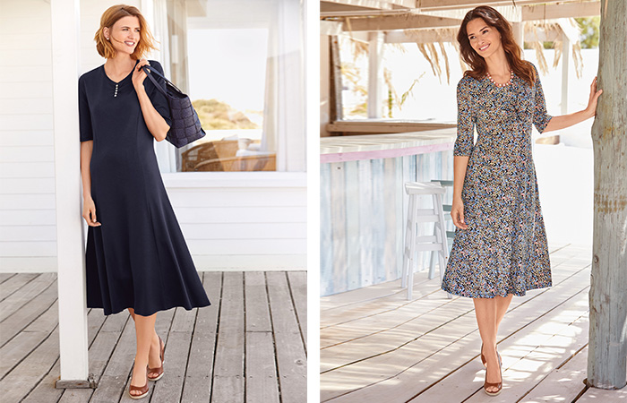 “Owning a versatile dress is a wardrobe must! Our cotton jersey dress is a perfect example, designed in a t-shirt style. Or our beautiful abstract print dress. Style either dress with a scarf, bracelet and heels for an instantly glamorous look or with flat sandals for a casual outfit. They can even be worn with wellies on a country walk!”