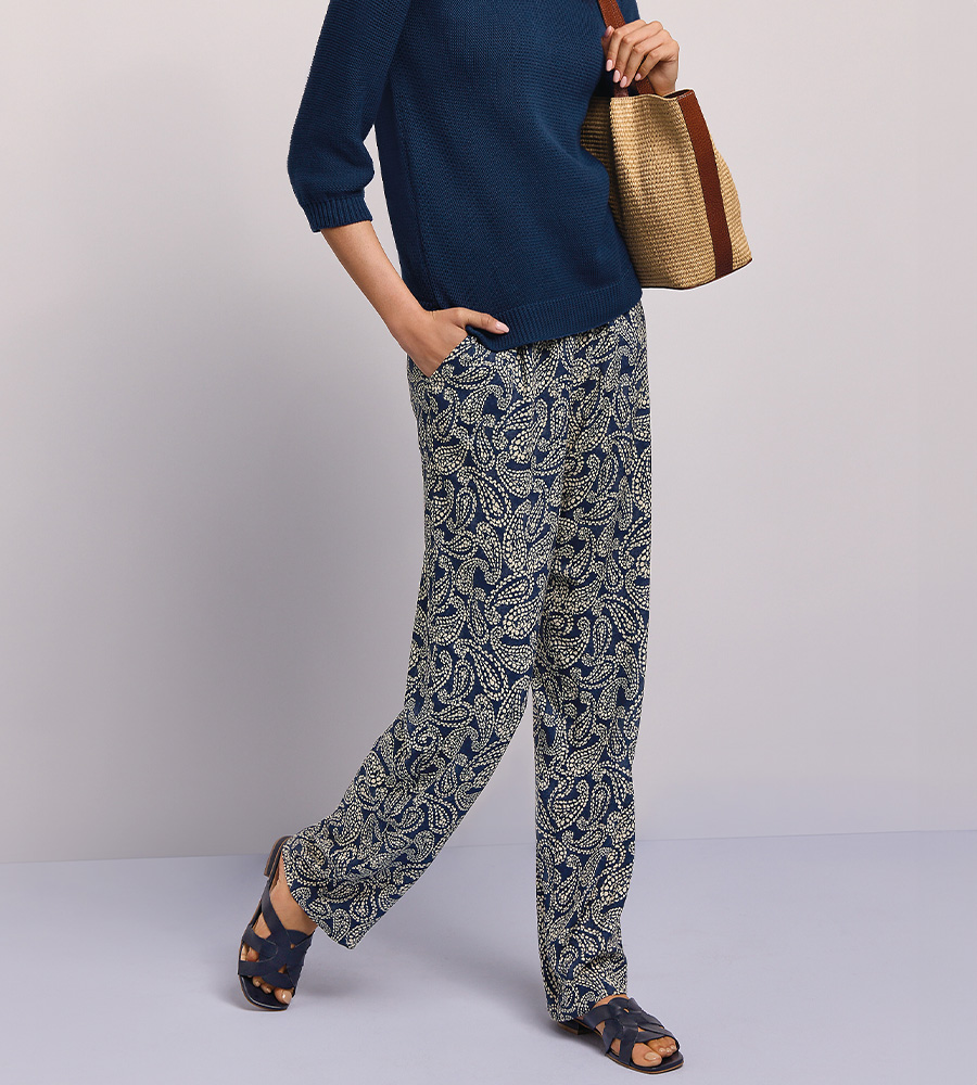 Printed Trousers – These versatile, intricate, and timeless navy and ecru Printed Trousers easily claim the top spot for patterned picks this season. Crafted in Great Britain with an effortless, relaxed pull-on style, these are the comfortable heroes you don't want to miss out on. Although comfortable, these French-printed pieces do not compromise on style, boasting a classic paisley pattern to inject your looks with stylishness this season.