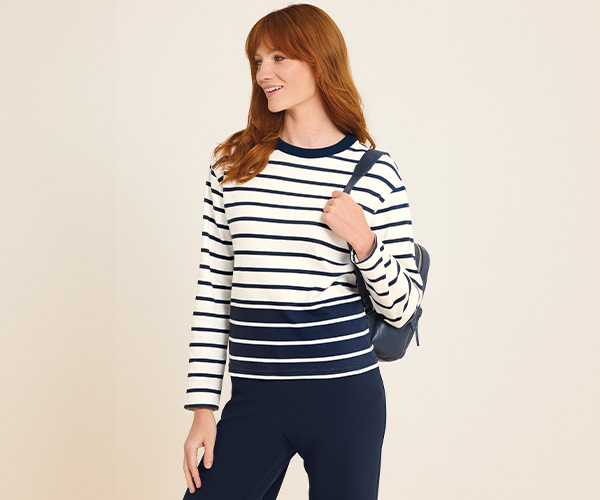What do I wear for a casual walk in the park in spring? Comfort is key! Our Broderie Anglaise Sweatshirt and Casual Trousers are perfect for a relaxed walk. The Block Stripe Jumper is another great option.