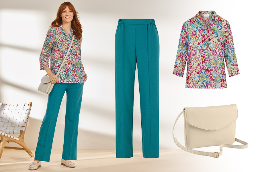 What's a good outfit for a spring city break? Comfortable yet stylish is the aim. Our Floral Blouse and Pull-on Trousers offer a chic and practical combination for exploring a new city.