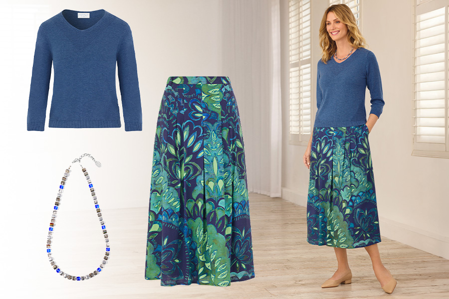 What should I wear for dinner out in spring? Our Printed Soft Pleat Skirt and V-Neck Jumper combination is ideal for a dinner out. It’s smart, stylish, and comfortable.
