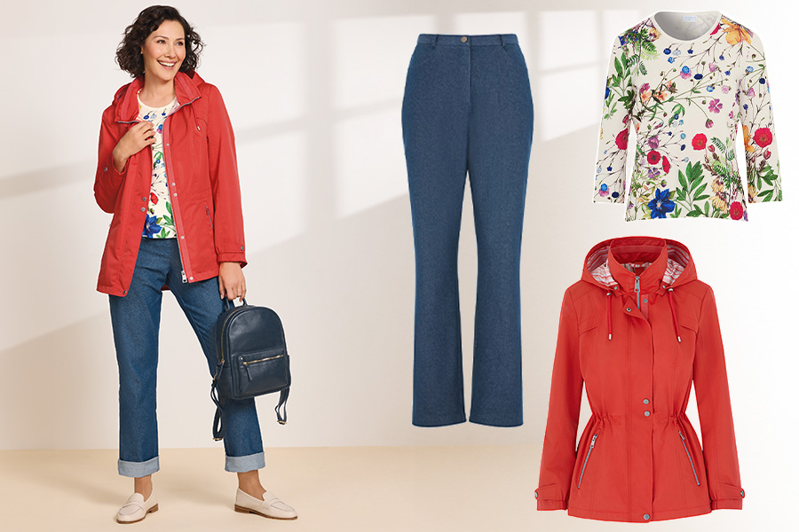 What colours are trending for spring? Look for uplifting tones like poppy red, soft blues, jade, teal, and classic neutrals. Our poppy-toned Rain Coat and blue and jade Printed Soft Pleat Skirt are perfect examples.