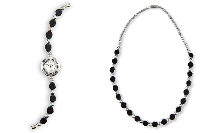 Made with sumptuous glass beads interspersed with silver plated hematite, our watch and necklace are handmade for us in England and finished with a secure magnetic fastening.