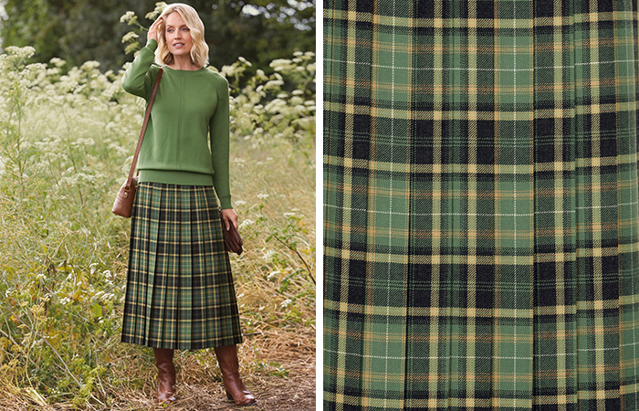 This is a lovely forest green coloured skirt, featuring a superb wool check woven in a British heritage mill. Pair the traditional checked pleated skirt with our complementing merino and cotton blend jumper.