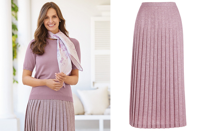 Perfect for the season, these superb pure wool tweed panel and checked pleated skirts are woven in a British heritage mill. These beautiful skirts are fully lined with side-back waistband elastication and side zip. Pair the checked pleated skirt with our merino turtleneck and Aran knit cardigan. Alternatively, pair the tweed panel skirt with our tuck front blouse and contemporary bead necklace.