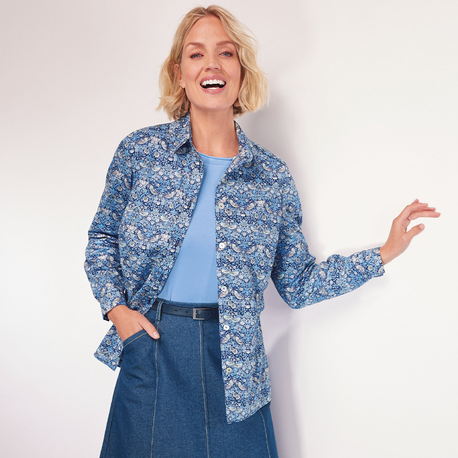 This Liberty Tana Lawn fabric showcases the timeless work of William Morris. In "Strawberry Thief," Morris invites us into a sun-dappled garden where mischievous thrushes steal sunshine-kissed berries. This iconic repeat print brings the freshness of early spring into your wardrobe, formed in a classic blouse style that can be both worn alone or layered with complementary tones of blue.