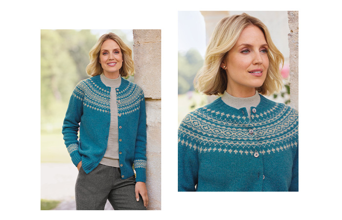 This Fairisle Knit Cardigan is one of our most luxurious and opulent garments from our Heritage Collection. Knitted in Scotland with some of the finest lambswool, this piece is irresistibly soft and comforting for the winter months. Offering a sense of luxury, this cardigan was crafted using a circular knit to build upon a delicate and timeless style. Additionally, the refreshing colours of Peacock and Ice create a stunning look, and the fibres of the 100% pure new wool create a heavenly layering piece that is effortlessly beautiful.