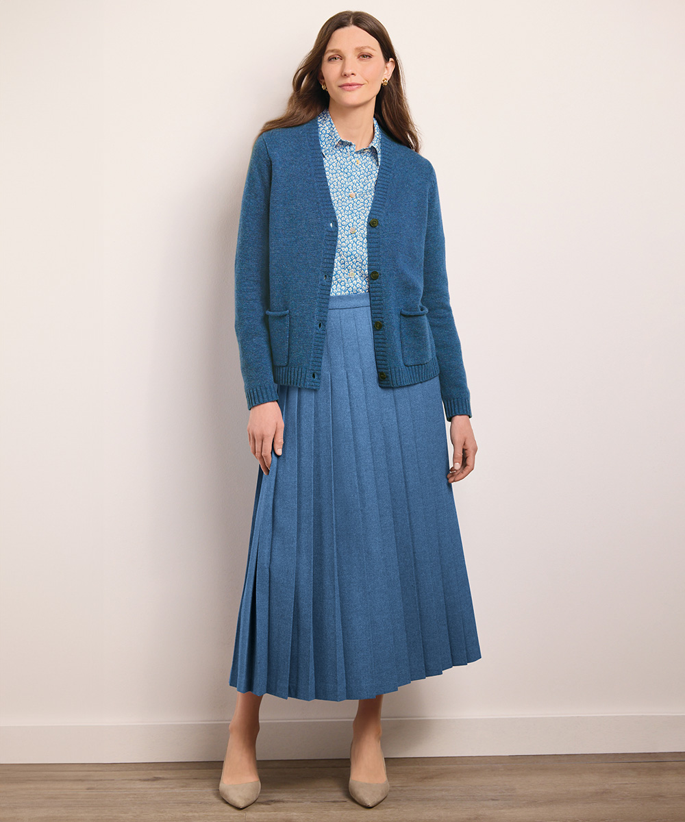 Crafted from a high-quality, durable tweed from a British heritage mill, this stunning and versatile Heritage Pleated Skirt features knife pleats that complement your figure. The gorgeous blue hue demonstrates how a heritage piece can become an effortless everyday staple while still embodying the classic and traditional style of British fashion. Complete this look with our 100% cotton Classic Blouse and our essential layering piece, our blue Lambswool Cardigan.