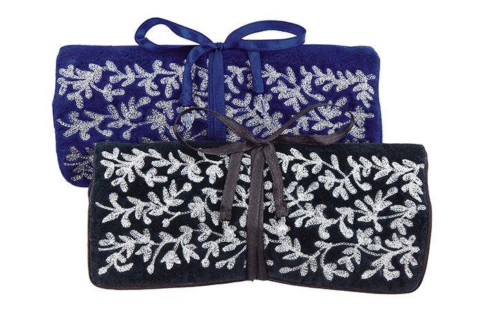 A pretty embroidered velvet jewellery roll in a choice of black or violet with a satin-lined inner compartment, two zipped inner pockets, holding straps and a ribbon and bead fastening. A great way to protect your precious jewellery whilst travelling, or as a jewellery box alternative.
