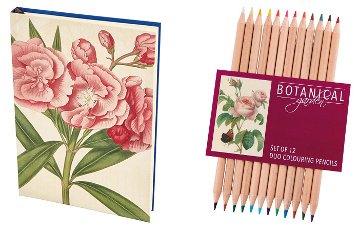 Featuring a wonderful print from the Kew Collection of botanical garden lithographs on the cover of this beautiful plain paper A5 notebook. Pair it with our botanical garden double-ended coloured pencils also from the Kew Gardens range, with a Rosa Centifiola print on the pack. The pretty notebook and colouring pencils are made in the UK.