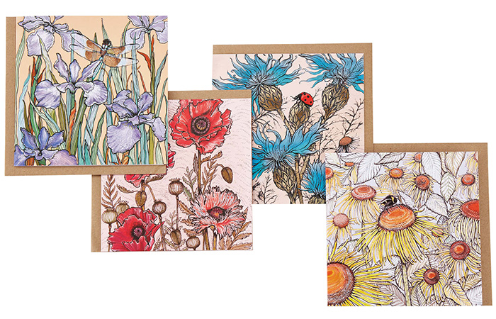 Enchanting illustrations of garden flowers and insects by artist Fay Miladowska, who grew up in rural Gloucestershire, feature on these cards made and printed with environmentally friendly materials. They come in four designs, two of each with eight envelopes.