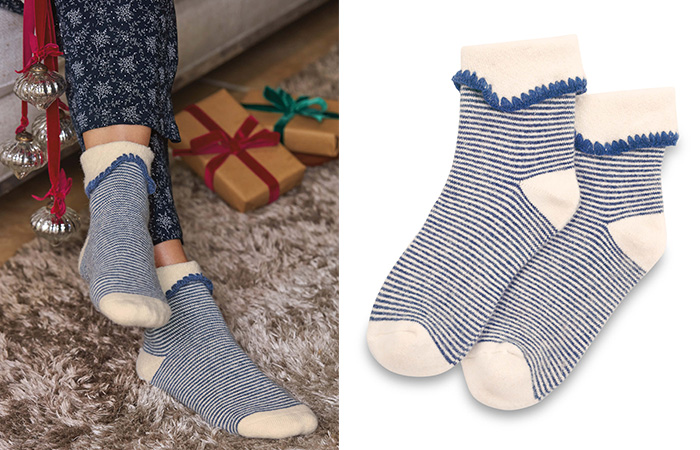 Featuring a pretty blue stripe, these striking bedsocks with plain heels and toes have turn over tops which are edged with blanket stitch. These cosy and comforting socks are a must-have gift this Christmas for individuals who love to snuggle up warm throughout the colder months.