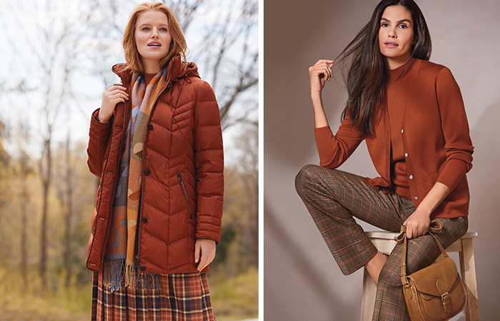 Our new collection features gorgeous garments in beautiful autumnal tones, including rusts, smoky blues, soft neutrals, fern greens and ochres to lift your spirits. Colour is a wonderful way to infuse energy into your outfits. It has such a positive impact on our mood and well-being. Autumn is the ideal season to inject warm, rich hues to your wardrobe. One shade that truly reflects the wonderful colours of the season is rust. This popular on-trend hue is beautifully highlighted throughout our latest range, complementing neutral hues and enhancing existing pieces you already own. Discover why you should add this lovely colour to your wardrobe.