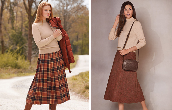 Create effortless monochrome outfits with the combination of rust and natural colours that blend with and complement each other. Choose your favourite from our checked pleated skirt or Donegal panel skirt and pair it with our pebble-coloured merino turtleneck. With wonderful seasonal warm russet colours, the fabric for this fully lined classic pleat skirt is woven in a British heritage mill. Alternatively, our new style fully lined tweed skirt has a gentle flare from a hip side panel.