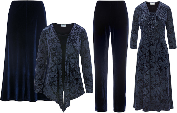 Midnight blue is a colour of elegance and confidence. In a gorgeous rich blend of blue and black, this deep shade is recognised for its resemblance to the colour of a moonlit night sky or the sea. Our devoré dress, mock-front top, velvet jersey skirt or trousers are the ideal timeless pieces to wear for any special event.