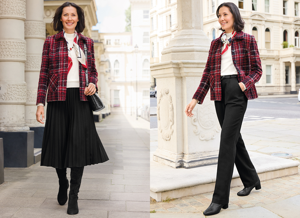 Getting together with loved ones is a truly special time, and you deserve to look and feel your absolute best! This outfit is perfect for winter gatherings, from cosy meals out to exciting evening events. Our Heritage Jacket is the ultimate cold-weather layering piece, beautifully crafted from a gorgeous wool-blend tweed. Its vibrant red, ecru, and black tones offer instant sophistication and versatility for an array of special occasions. Team this stand-out piece with our popular Merino Turtleneck and choose between the sleek Classic Trousers or the flowing Sunray Skirt. Finish the look with a sparkle: accessorise with our stunning red and gold Hoop Earrings and our elegant Beaded Necklace.