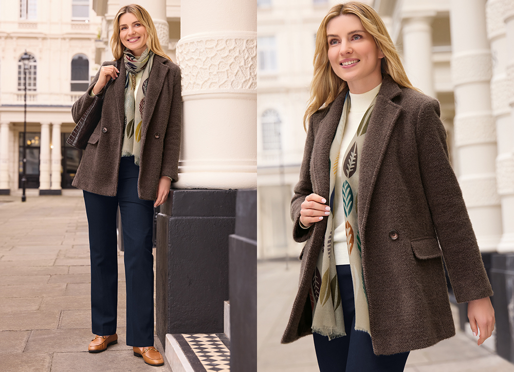 Heading out for a day of errands or a quick lunch? It’s crucial to feel comfortable without sacrificing style! Our Textured Blazer in a versatile truffle shade is the perfect solution. It effortlessly pairs with our Merino Turtleneck, creating a balanced mix of light and dark tones that is instantly chic. To complete this foundation, we recommend our Navy Classic Trousers, a true investment staple you’ll find yourself reaching for again and again. For added warmth on those colder days, finish the look with our beautiful Wool Scarf, featuring an intricate seasonal leaf design.