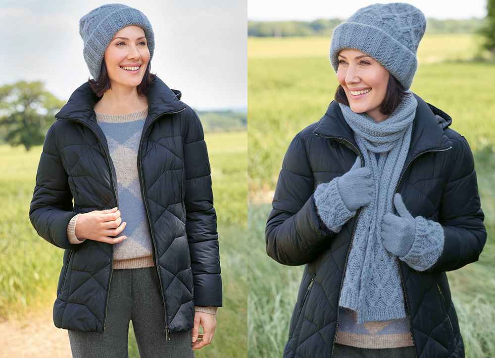 For those days you want to embrace the bright sunshine and crisp air, perhaps even out on the water, this ensemble has you covered. Our Quilted Coat is the perfect comfortable layer, boasting hand-warming pockets, a detachable hood, and a secure zip front—a true essential when the air cools. Pair it with our Diamond Pattern Jumper, a must-have warming piece that adds beautiful texture to your winter collection. Completing the look, our grey Classic Trousers are a versatile hero, guaranteed to complement not just this outfit, but a huge variety of looks all winter long. Don't forget the accessories: for the absolutely chilliest days, reach for our matching blue Mohair Scarf, and Gloves.