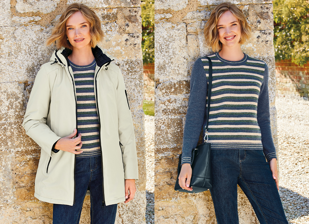 From a day trip to a week-long escape, this is the perfect outfit to keep you comfortable and chic at the seaside. Anchor the look with our renowned Striped Jumper. With its luxuriously warm feel and uplifting palette of blue, green, and cream, it's a casual classic and a brilliant, long-lasting investment for your winter wardrobe. To combat the infamous unpredictability of English winter weather, simply layer up with our essential All-Weather Coat in versatile stone. Finally, meet the trousers you'll live in: our Comfort Jeans. This true investment piece offers ultimate versatility, easily styled up or down for literally any event on your calendar.