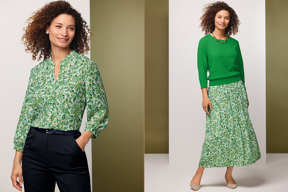 We are thrilled to welcome the beauty and qualities that our French manufacturer has to offer with this green floral print. This three-quarter sleeved blouse and soft pleated skirt has been designed to perfection, allowing this printed chiffon cloth to provide a graceful, feminine and fluid style for the season ahead. Pair together for special occasions and save each piece to team separately with your existing wardrobe.